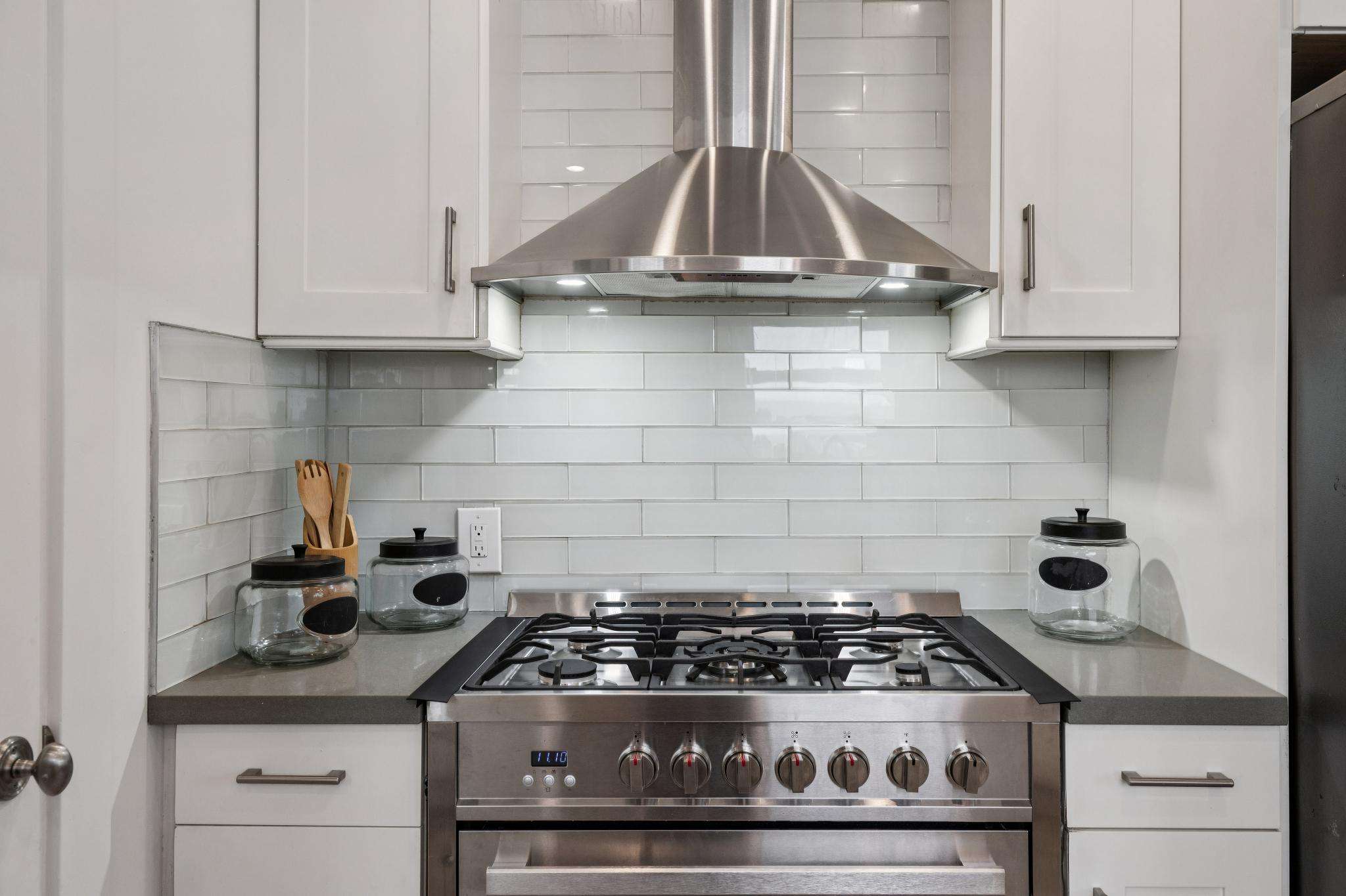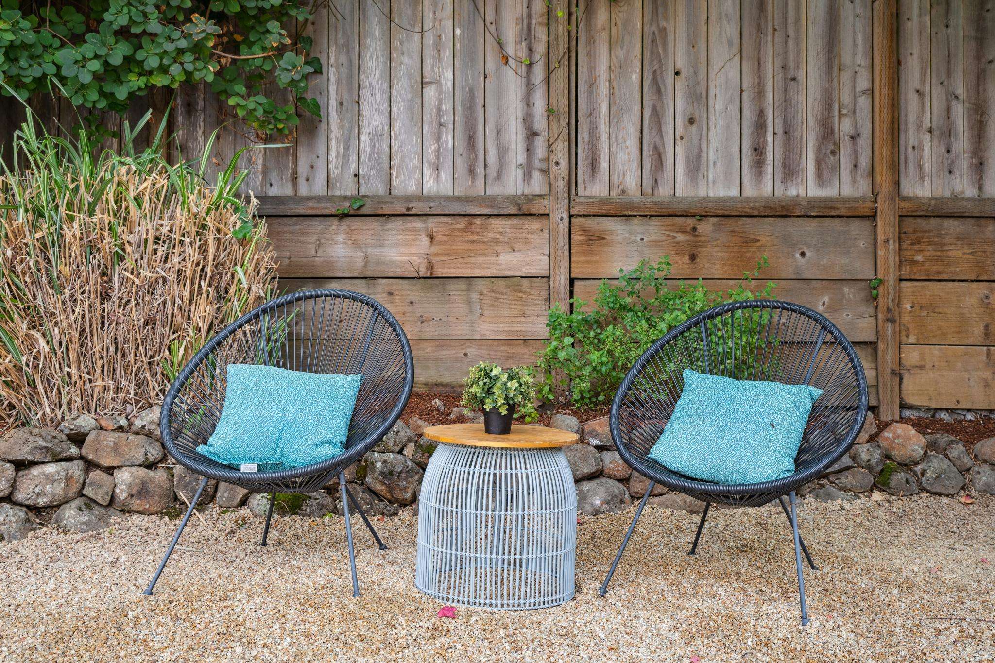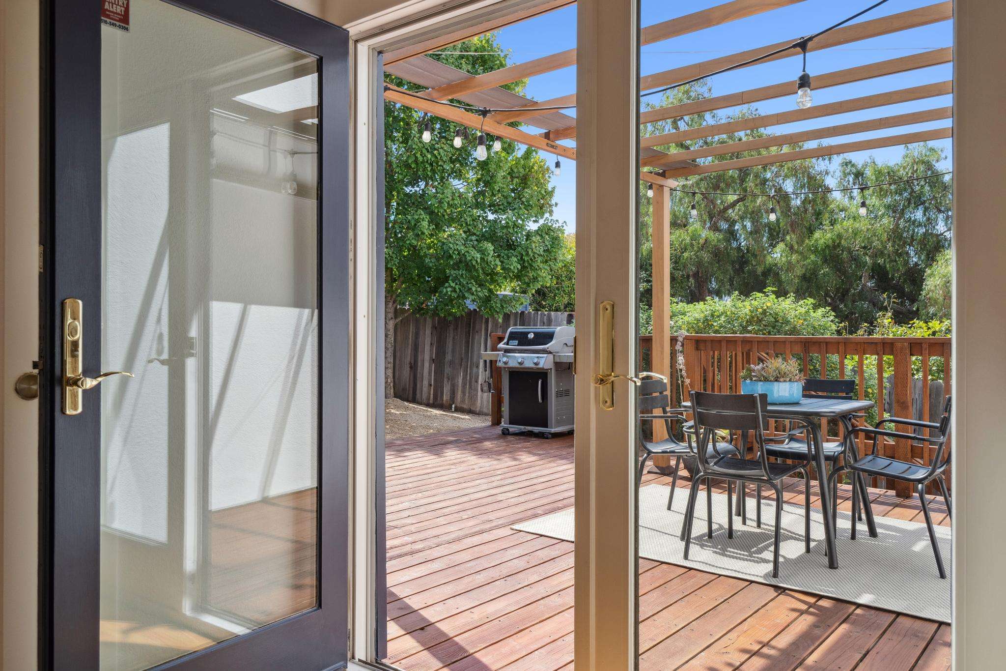 A full laundry room and bonus room are tucked away on the ‘mezzanine’ level off the kitchen, opening to the side yard. There's one bedroom on the main, with a full bath, and another bedroom and the primary bedroom suite located a few steps up from the rest of the house, with French doors leading out to the back deck. The backyard oasis features a redwood deck shaded by a pergola with retractable awning, with loads of space for hosting family gatherings and guests… or peaceful moments of morning coffee and yoga, or evening meals. Step from that into an urban garden, with mature lime, pomegranate, fig and peach trees, and raised bed gardens. So unexpected, and lovely for indoor/outdoor entertaining!